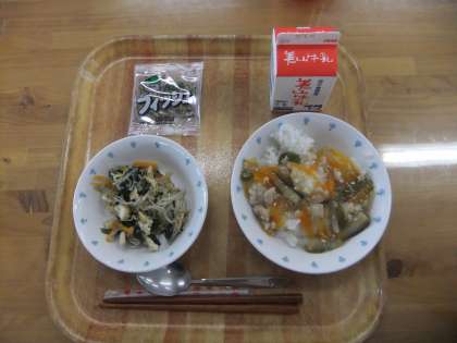 今日の献立は,夏野菜のあんかけごはん・牛乳・もやしの煮びたし・じゃこでした。夏野菜のあんかけごはんは,万願寺とうがらしも入り、いろいろな野菜が色鮮やかで,大変おいしくいただけまいた。