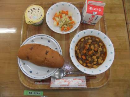 今日の献立は、チーズコッペパン・牛乳・チリコンカーン・野菜のホットマリネ・・プリンでした。チリコンカーンは、大豆がたっぷり入ったカレー風味の豆料理です。たんぱく質が豊富で“畑の肉”と呼ばれる大豆を是非、ご家庭でも食べていただきたいと思います。