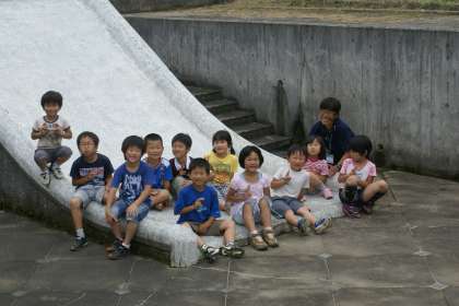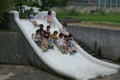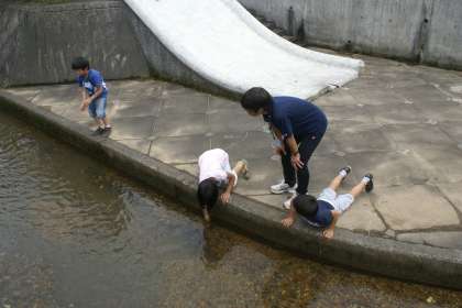 地域の方にきれいにしていただいた親水公園,1年生が元気に遊んでいます。みんなとってもうれしそうです。