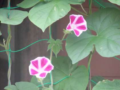 8月6日 日に日に多くのアサガオの花が咲き出しました。赤・青・ピンクなど5〜6種類の花が緑のカーテンの中に咲いています。全部で10種類の色のアサガオが咲く予定です。これからが楽しみです。