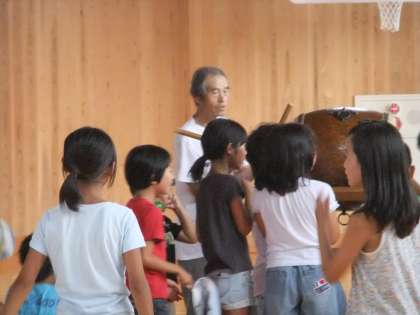 「2012 山国夏まつり」のプログラムの一つ,「納涼まつり」が18:00〜から運動公園駐車場で行われます。20:00〜からは,「大踊り」と称して,山国の伝統文化「山国音頭」「丹波音頭」をみんなで踊ります。その踊りの練習が,「こどもまつり」の中で行われました。みんな夜の踊りを楽しみにしながら練習していました。