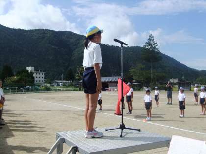 聖火のもと,開会式が始まりました。校長先生が「今日は,京北第二小学校の運動会です。多くの来賓・地域の方,そして保護者の方に,オリンピックやパラリンピックの感動を再びみなさんが見せてください。」と挨拶でおっしゃいました。選手代表は,「みんなの力をひとつにして頑張りましよう。」と力強い言葉でした。その後,赤・青・黄色のリーダーの選手宣誓がありました。