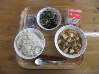 今日の献立は,麦ごはん・牛乳・とうふの四川風・ほうれん草ともやしのいためナムル・じゃこでした。とうふの四川風は,味付けも良く大変おいしく頂けました。ほうれん草ともやしのいためナムルも米酢の味がちょっぴりしておいしかったです。