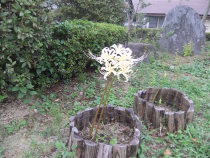 9月22日 学校の玄関前に白花ヒガンバナが大変きれいに咲いていました。今日は「秋分の日」,お彼岸にぴったりの花です。