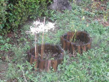 9月24日 咲き出した彼岸花の白。玄関前の庭に綺麗な花を付けています。地域の方も見に来られています。後ろには,赤の彼岸花も咲き出しそうです。