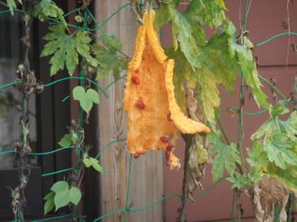 9月24日 今年もたくさんのツルレイシが出来ました。夏は,1日15〜20本毎日収穫していました。9月も後半ですが,ツルにはまだ10本ぐらいぶら下がっています。種取り用のツルレイしが黄色くなって,赤の種を地面に落としています。来年用の種もたくさん出来ました。