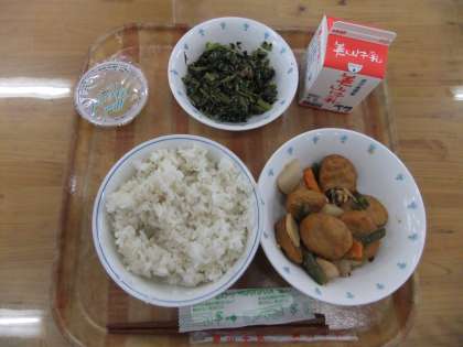 今日の献立は,麦ごはん・牛乳・平天とこんにゃくの煮つけ・小松菜のごまいため・りんごゼリーでした。平天とこんにゃくの煮つけは,もちっとした平天とプリッとしたこんにゃくが甘辛くごはんに合うように煮つけていただいて,とてもおいしかったです。