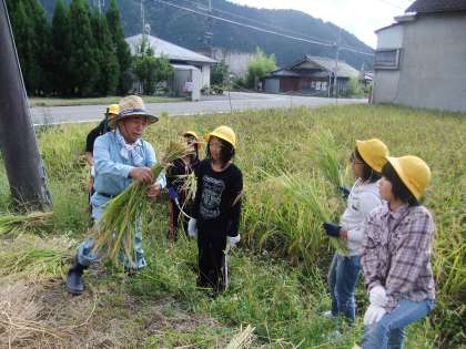 10月2日(火)今日の午後に5年生が稲刈りに行きました。地域の方の田んぼの一角を借り,6月に田植えしたのが豊かに実りました。田植えから今日の収穫までお世話になった地域の方の指導のもと,慣れない手つきでしたがしっかり稲刈りができました。