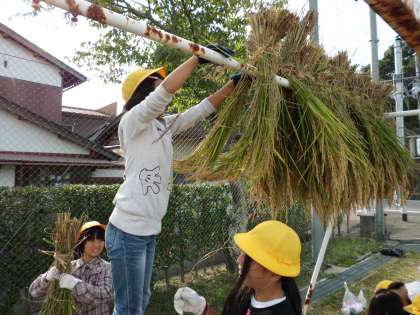 5年生は総合的な学習の時間に「レッツ米づくり!」をしています。台風で稲刈りができるか心配していましたが,今日は秋空のしたでの稲刈りでした。稲の色や高さを以前と比較しながら稲刈りをしました。刈った稲の束をわらを使って束ねるのにも苦労し,地域のゲストティチャーの方に教わりました。稲の束は学校に干しました。次の脱穀も楽しみです。