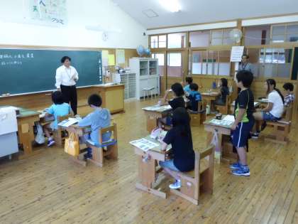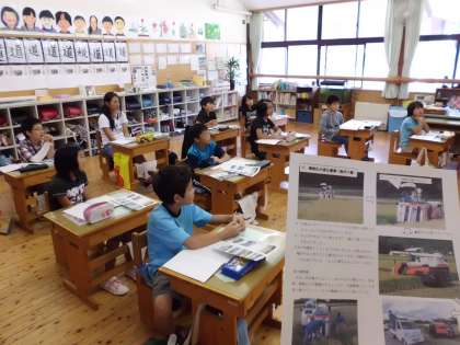 5年は昨日,稲刈りをしました。今日は社会で稲刈りの復習として,「機械化が進む農業(稲刈り編)」の学習をしました。 子どもたちは,釜で稲刈りをするのにも一苦労でした。今日は校長先生の授業で,昔なら3反の畑を4〜5人で3日かかることや,大型機械(コンバイン)なら,1人でたった1時間余りで刈り取れることに,子どもたちは驚いていました。