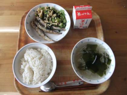 今日の献立は,麦ごはん・牛乳・ししゃものからあげ・青菜の中華風いためもの・わかめスープでした。ししゃものから揚げは、フライヤーでカラッと香ばしく揚げていただいて,おいしかったです。青菜の中華風いためのは、小松菜と揚げがにんにく風味でいためてありました。チキンスープのうまみもしみ込んでい,おいしかったです。