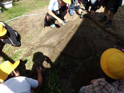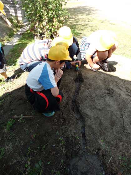 5年生は理科で「流れる水のはたらき」を学習しています。今日は「流れる水には,どんなはたらきがあるのだろうか。また,水の量がふえると流れる水のはたらきは,どうなるのだろうか。」という学習問題を解決するために,運動場に出て実験をしました。子どもたちは,水の量をふやして,ふやす前と流れのはたらきをくらべながら実験していました。