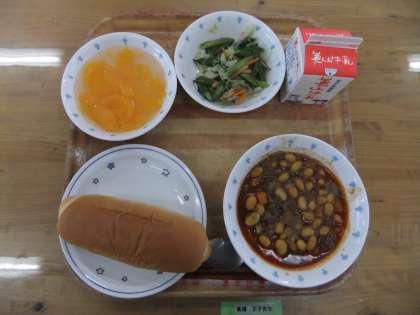 今日の献立は、味付けコッペパン・牛乳・チリコンカーン・アスパラガスのソティ・手作りゼリーでした。チリコンカーンは、やさしいカレー味で、たくさん大豆が入っていましたが、食べやすかったようです。今日は、“目の日”でした。ビタミンAがたっぷり入っている緑黄色野菜を食べて、よい目を保ってくださいね。