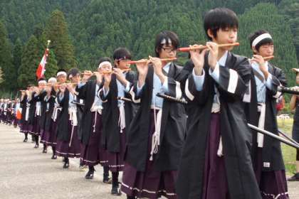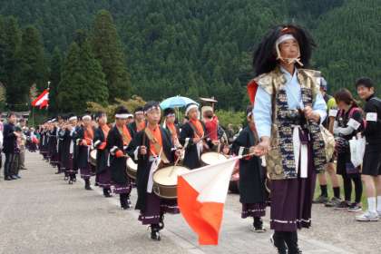 10月14日 秋空のもと,山国祭りのさきがけフェスタが10時から開催されました。京都市をはじめ,いろいろな地域から多くの参観者が来られていました。午後1時,山国軍楽隊を先頭に御輿が出て来ました.この軍楽隊には多くの小学生や中学生が入っています。