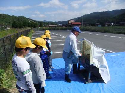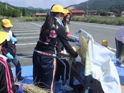 10月16日(火)今日の3・4校時に,学校の横にある駐車場で,地域の方に教えていただいて。先日刈った稲を脱穀させてもらいました。昔ながらの脱穀機を使って上手に脱穀していました。