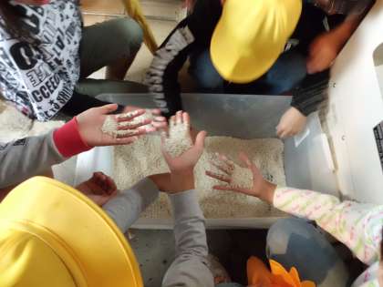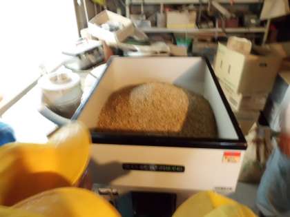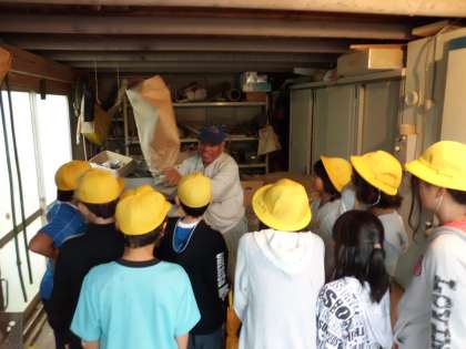 昨日脱穀をして,天日干しをした籾を持って,地域のゲストティーチャーのお家へ精米をしてもらいに行きました。茶色の籾を精米機に入れてもらい,3回精米すると白いお米が出てきました。子どもたちは手で触れて,形や大きさを観察していました。