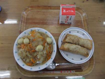 今日の献立は、ごはん・牛乳・春巻き・カレーあんかけごはんでした。春巻きは、一つ一つ手作りで心をこめて作っていただきました。具を手早く春巻きの皮で巻いて、すぐに揚げていただいたので、皮がパリッとしていて中の具はとろっとやわらかくとてもおいしかったです。