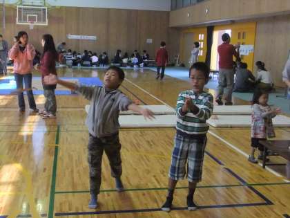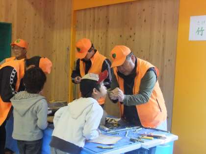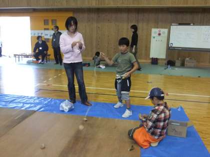 少年補導委員会や大杉塾など地域の諸団体もコーナーを設け,子どもたちにいろいろな遊びを教えていただきました。竹笛を教えてもらった子どもたちは「ピー,ピー!」と小鳥のさえずりを鳴らして喜んでいました。また,竹とんぼ・コマ回しなどの昔の遊びコーナーもありました。