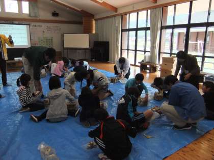 10月29日(月)4校時に4・5年生が,中央市場の京果さん来て頂いて,しいたけ栽培にチャレンジしました。写真を見ながら,しいたけについての話を聞いたあと,実際にしいたけ栽培を行いました。
