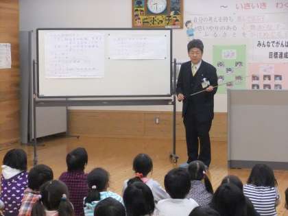 11月2日(金)今日の朝会は,京北農協の河合 正樹様に来ていただき,農業の仕事や京北の農業のことについてくわしくお話していただきました。特に,京北で採れる有名な野菜や納豆など,「食」生活の大切を,子どもたちに分かりやすくお話していただきました。子どもたちも大変興味深く,お話を聞いていました。