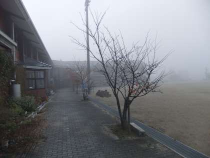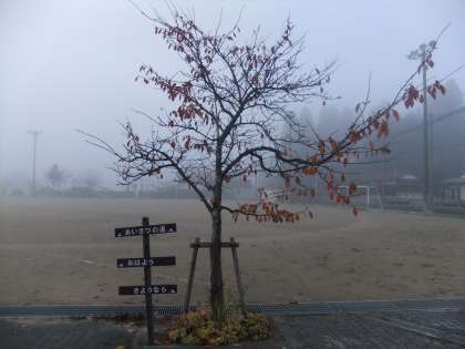 11月13日 今朝の京北は,霧が立ちこめ気温も下がっています。「あいさつの道」の桜並木も落葉が始まりました。