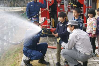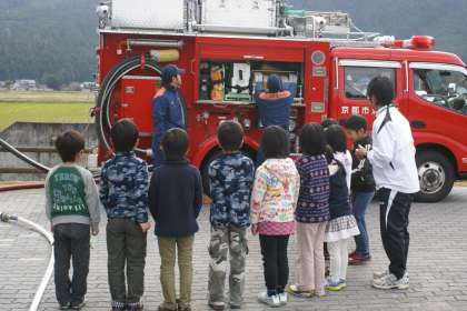 1年生 じどうしゃくらべの学習でクレーン車にひき続き 消防車 救急車がやってきました。