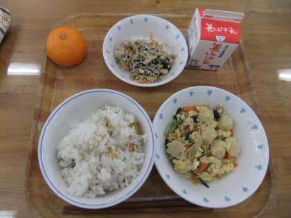 今日の献立は、あげいもごはん・牛乳・高野豆腐の卵とじ・もやしの煮びたし・みかんでした。あげいもごはんは京北メニューで、地元産のさつまいもを油で揚げてごはんに混ぜました。さつまいもの香ばしい香りと甘みがごはんとよく合っていておいしかったです。