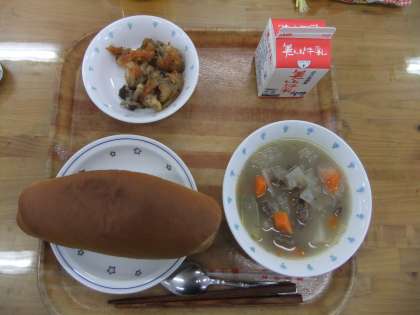 今日の献立は、黒糖コッペパン・牛乳・たらのエスカベージュ・ポトフでした。たらのエスカベージュは、イタリア料理でした。たらに小麦粉とかたくり粉をつけて油で揚げ、たまねぎとにんじん、しめじをオリーブ油で炒めて、りんご酢で味付けをした調味液につけました。バジルもきかせて、とてもおいしかったです。