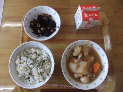 今日の献立は,菜めし・牛乳・関東煮・ひじき豆でした。菜めしは,雑ぜごはんでとてもおいしかったです。関東煮は,子どもたちも大好きで,色んな具が入っていてとてもおいしくいただけました。