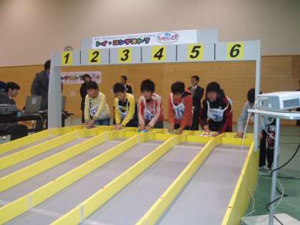 トイコンテスト7に出場しました。手作りのゴム動力の車でレースをします。3年生の児童は参加180名中4位・5年生の児童は上級クラスに出場5位と健闘しました。