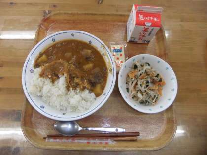 今日の献立は,麦ごはん・牛乳・カレー・大根ホットサラダでした。大根ホットサラダは,地元でとれた新鮮な大根を使いました。細い短冊に切って、スチームにかけてツナとカットわかめも入れて炒めました。マヨネーズとの相性がとてもよくておいしかったです。