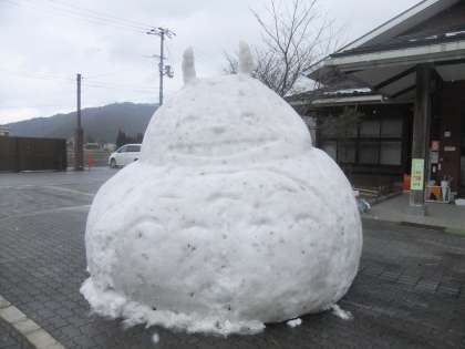 2月20日 17日に突如現れたトトロの雪だるま。18日の雨でずいぶん解けましたが,今朝小塩地域から雪を運び修復しました。朝から市内のあちこちから「見に行きます」「土日までありますか」などの問い合わせの電話がなっていました。これで日曜日ぐらいまで持ってくれるかな?