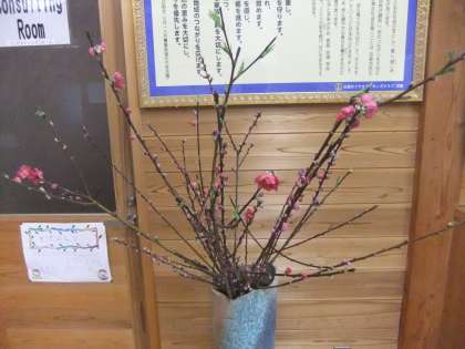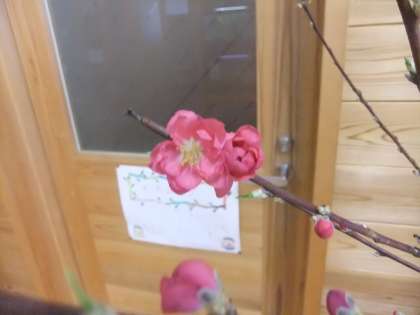 3月5日 今朝の京北は,7時現在マイナス1度。近隣の家の屋根はうっすらしろくなっています。3月に入り,玄関の華も桃の華になりました。
