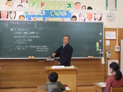 3月6日(水)4校時に,3年生が社会科の学習で,ゲストティーチャーとして,地域にきていただき,地域の「丹波音頭」についてのお話を聞きました。