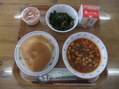 今日の献立は、バターうずまきパン・牛乳・大豆と牛肉のトマト煮・ほうれん草のソティ・プリンでした。今日は、3年生の授業でお世話になった地域の方との交流給食をして子どもたちも楽しくなごやかに給食をいただきました。今日のほうれん草は、地域でとれたものでした。大きく育った、立派なほうれんそうでした。とても甘みがあっておいしかったです。