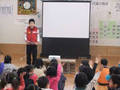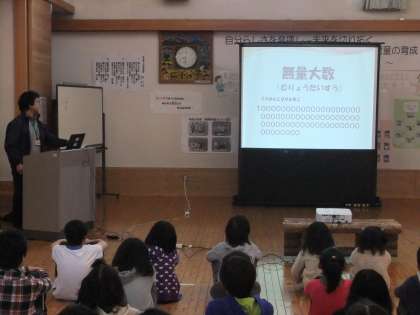 3月8日 今日の朝会では,教務主任の先生が数字の話をしました。1より大きな数,小さな数をどういうふうにいうのか,スクリーンを使っておもしろく話しました。本校では,教職員が朝会で得意なことや趣味などを話し,自己紹介をします。最後に児童会の子どもが感想をみんなに聞きました。多くの子どもが感想を発表していました。