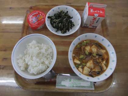 今日の献立は、麦ごはん・牛乳・豆腐の四川風・ほうれん草ともやしのいためナムル・りんごゼリーでした。豆腐の四川風は、ケチャップが入っていたので少し甘めの味付けで子どもたちも食べやすかっやようです。しゃりっとしたりんごゼリーを楽しんで食べていました。
