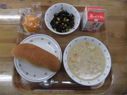 今日の献立は、ミルクコッペパン・牛乳・えびのクリームシチュー・ひじきのソティ・はっさくでした。えびのクリームシチューは、えびのうまみがよく出ていました。手作りのルーは、なめらかでとてもやさしい味でおいしかったです。はっさくは、皮をむいたり、少し苦みのある味が苦手な子どもがいました。でも残さずに頑張って食べられました。