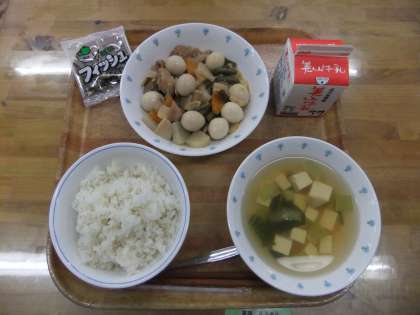 今日の献立は、麦ごはん・牛乳・プリプリ中華炒め・豆腐と青菜のスープ・じゃこでした。プリプリ中華いためは、にんにくやごま油の香りがよく、子どもたちの大好きな献立です。こんにゃくの歯ごたえもよく、うずら卵も大事そうに食べていました。豆腐と青菜のスープは、青梗菜がシャキシャキとしていて、あっさりとした味付けでおいしかったです。