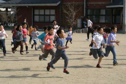 春の日差しの中 子どもたちは朝マラソンにもなれ 頑張っています。1年生も気合い十分 頑張っています。