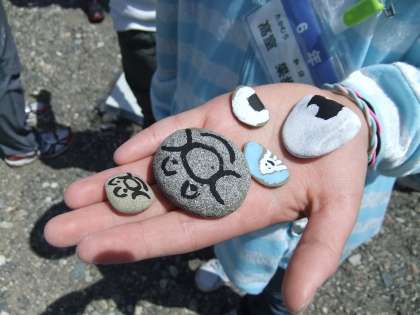 上桂川の河原で石に絵をかいたり、石投げをしたり、稲荷神社で宝探しやだるまさんがころだをしたり、黒田小学校跡地でそりすべりをしたり・・と楽しかった歓迎遠足。