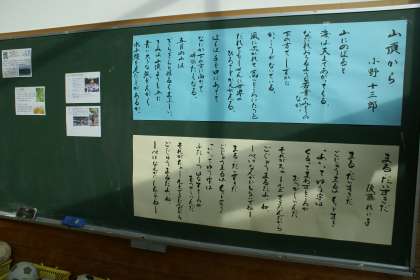 児童昇降口に今月の詩と漢字が掲示されています。今月の詩は高学年用に「山頂から」小野十三郎 低学年用に「まるだいすき」後藤れい子 です。今月の漢字は「優」で漢字の由来や意味が書かれています。いずれも毛筆で書かれています。ご来校の折は是非ご覧ください。