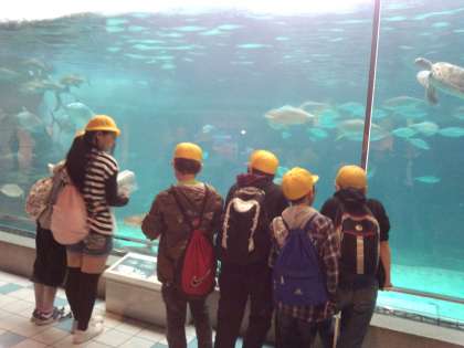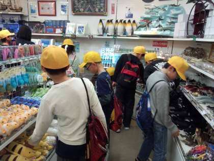 予定通り、水族園に到着しました。大水槽ではたくさんの魚たちが仲良く泳いでいます。子どもたちもうっとり見とれていました。そして、ここでもお土産を選びます。残金を見ながら真剣に選んでいます。