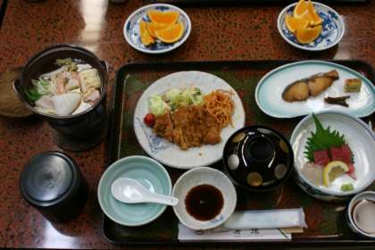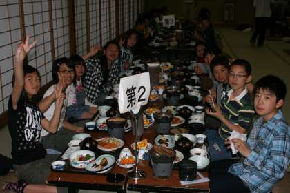 旅館でのご馳走には,みんな笑顔でした。
