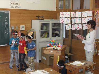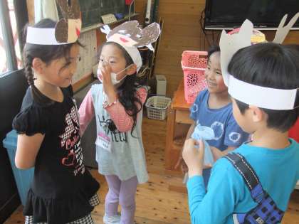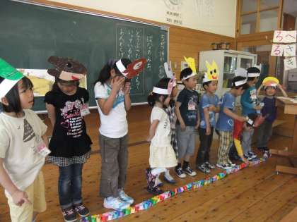 「かぎかっこ」の中には台詞があることを勉強し、教科書には載っていない動物達の台詞も想像して音読劇をしました。一人ずつ自分のやりたい動物のお面を作り、いろんな台詞を考えました。