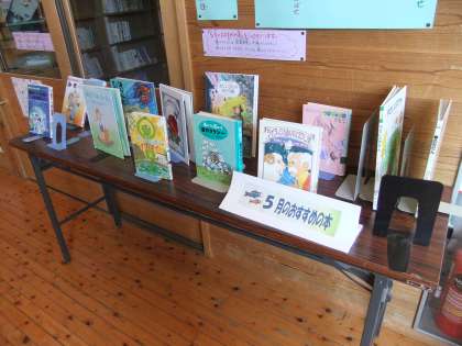 図書室の前には、図書支援員さんのおかげで、季節にあった本や新しく入った本などが「おすすめの本」として並び、気に入った本は借りることもできます。