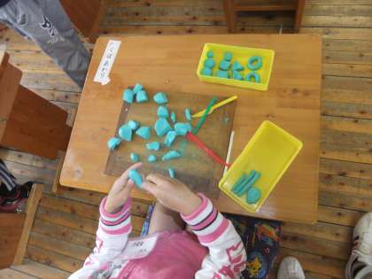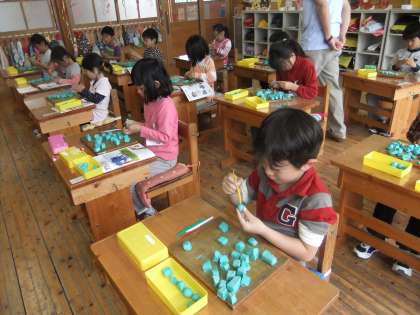 油粘土をへらでいくつものブロックに分け、それを好きな形の積み木に成形しました。