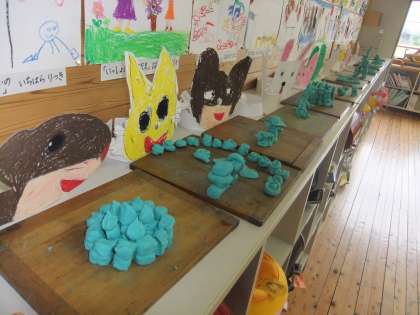 できた粘土の積み木で、お城やケーキ、トンネルなど、好きな物を作りました。