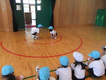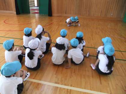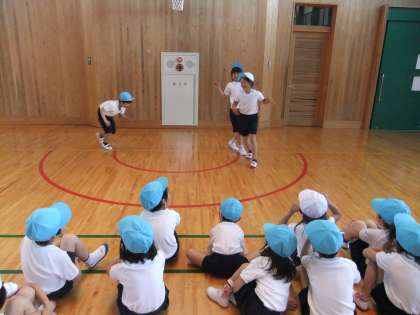 体育科の「むしになって」では、いろんな虫になりきって、擬音を付けながら動きを考えて発表します。