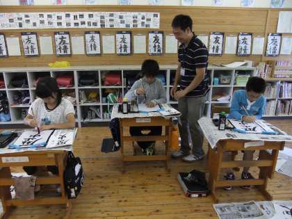 今回の書写名人の先生のお話は「硯(すずり)」です。字が表すように硯は石からできていることや良い硯の見分け方などを教えていただきました。その後少し難しい「歴史」という字を書きました。また、学年・名前のお手本を作ってもらいましたので、それを横に並べて、小筆も慎重に運び、名前も上手に書けました。